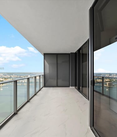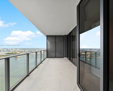 This never-before-occupied residence offers panoramic views of Biscayne Bay, Atlantic Ocean, & Miami’s skyline.